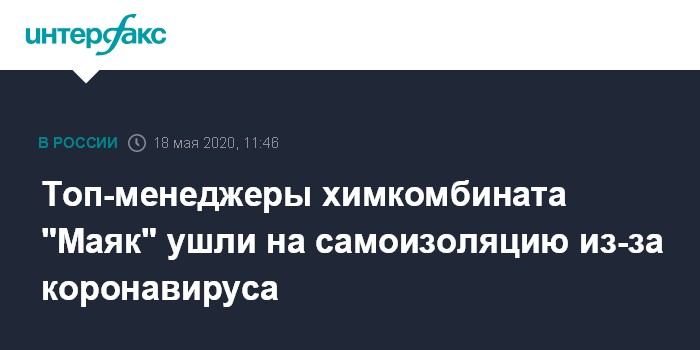 Москва. 18 мая. INTERFAX.RU - Несколько топ-менеджеров производственного объединения "Маяк" (Озерск, входит в ГК "Росатом") ушли на самоизоляцию после того, как сотрудница химкомбината заразилась коронавирусом. Об этом в видеообращении сообщил гендиректор предприятия Михаил Похлебаев.