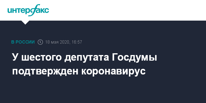 Москва. 18 мая. INTERFAX.RU - У шестого депутата Госдумы подтверждено заражение коронавирусом, сообщила в понедельник советник спикера нижней палаты парламента Анастасия Кашеварова.