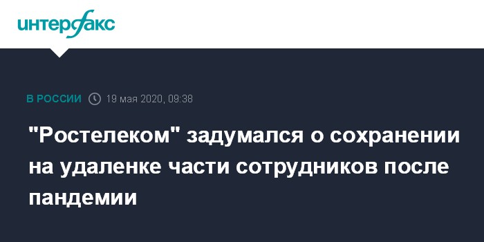 Москва. 19 мая. INTERFAX.RU - Оператор связи "Ростелеком" изучает возможность ввести удаленную работу на постоянной основе для части сотрудников после пандемии, говорится в квартальном отчете компании. Кого именно могут оставить на удаленке, не уточняется.