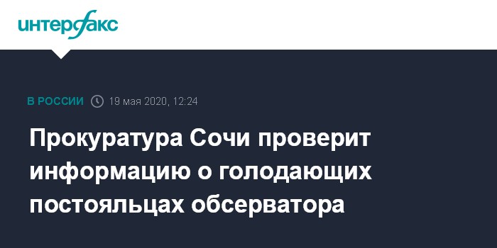 Москва. 19 мая. INTERFAX.RU - Прокуратура Сочи проверяет информацию СМИ о голодовке в местном коронавирусном обсерваторе, сообщили "Интерфаксу" во вторник в пресс-службе надзорного ведомства Краснодарского края.