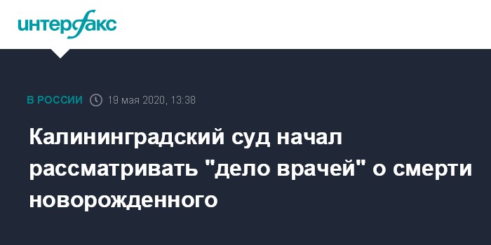 Москва. 19 мая. INTERFAX.RU - Калининградский областной суд начал предварительные слушания по резонансному уголовному делу двух врачей, которых обвиняют в смерти новорожденного. По делу проходят и.о. главврача роддома №4 Елена Белоя и реаниматолог-анестезиолог перинатального центра Элина Сушкевич.