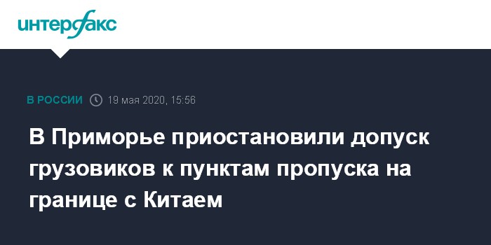 Москва. 19 мая. INTERFAX.RU - Движение грузовиков к пунктам пропуска на российско-китайской границе в Приморье с 20 мая приостанавливается на десять дней по решению регионального оперштаба по борьбе с коронавирусом, сообщила пресс-служба правительства региона.