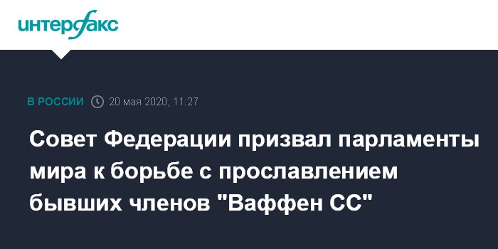 Москва. 20 мая. INTERFAX.RU - Совет Федерации призвал парламенты мира противодействовать прославлению бывших членов "Ваффен СС" и других движений нацистского и фашистского толка, привлекать к ответственности за отрицание Холокоста, а также осудил умаление роли СССР в победе во Второй мировой войне.