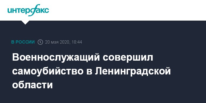 Москва. 20 мая. INTERFAX.RU - Военнослужащий-контрактник, служивший в городе Луга (Ленинградская область), предположительно покончил жизнь самоубийством. Об этом говорится в сообщении пресс-службы Западного военного округа.