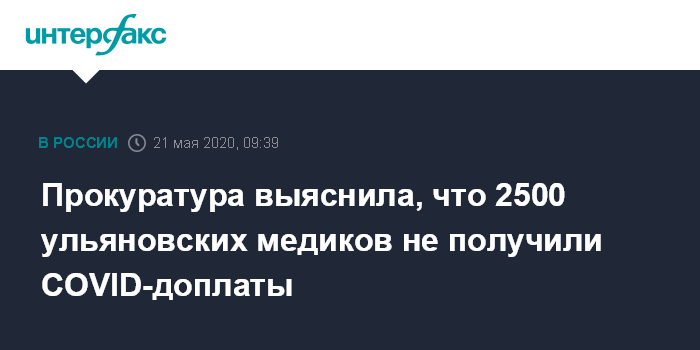 Москва. 21 мая. INTERFAX.RU - В Ульяновской области около 2500 медиков не получили федеральные надбавки за работу с коронавирусными больными, выяснила региональная прокуратура. Прокуроры потребовали привлечь к ответственности чиновников областного Минздрава, которые не обеспечили перечисление этих доплат.