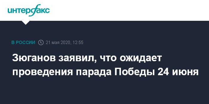 Источник назвал 24 июня возможной датой голосования по поправкам в КонституциюЧитать подробнее"Похоже, что 24 июня, в годовщину Парада Победы (1945 года - ИФ), собираются провести парад на Красной площади. Мы это только приветствуем, но настаиваем на том, чтобы никакой маскировки и драпировки на Мавзолее не было", - сказал Зюганов в четверг "Интерфаксу".