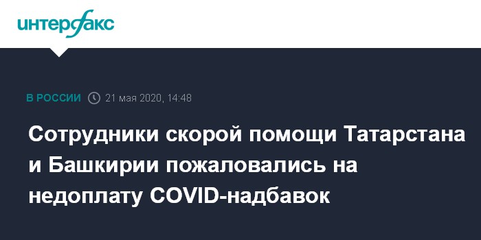 Москва. 21 мая. INTERFAX.RU - В Башкирии водители скорой помощи трех больниц получили за работу с коронавирусными больными надбавки от 400 до нескольких тысяч рублей, сообщили в республиканском профсоюзе работников здравоохранения. В апреле президент Владимир Путин предложил доплачивать водителям за это по 25 000 рублей в месяц.