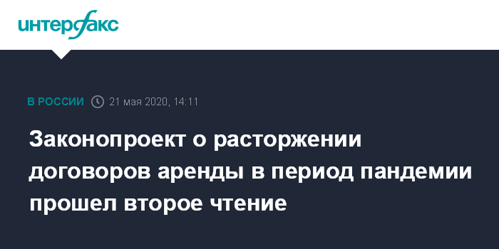 Москва. 21 мая. INTERFAX.RU - Госдума приняла во втором чтении законопроект о праве арендаторов досрочно расторгать договора аренды до 1 октября 2020 года. Это положение входит в пакет поправок о поддержке бизнеса в период пандемии (№ 953580-7), норма об аренде дорабатывалась накануне.