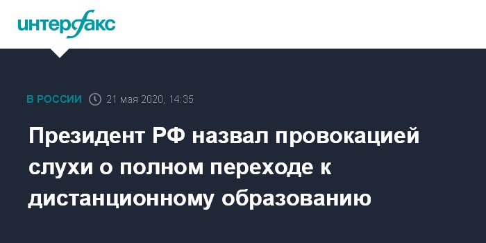 Москва. 21 мая. INTERFAX.RU - Президент РФ Владимир Путин назвал "откровенной провокацией" слухи о полном переходе к дистанционному образованию и закрытии традиционных учебных учреждений.