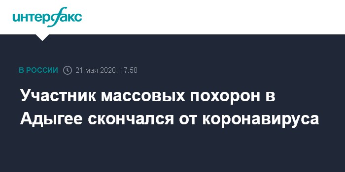 Москва. 21 мая. INTERFAX.RU - Один из заразившихся COVID-19 в Красногвардейском районе Адыгеи, где после многолюдной похоронной процессии зафиксирован очаг коронавируской инфекции, скончался в госпитале, сообщает министерство здравоохранения республики.