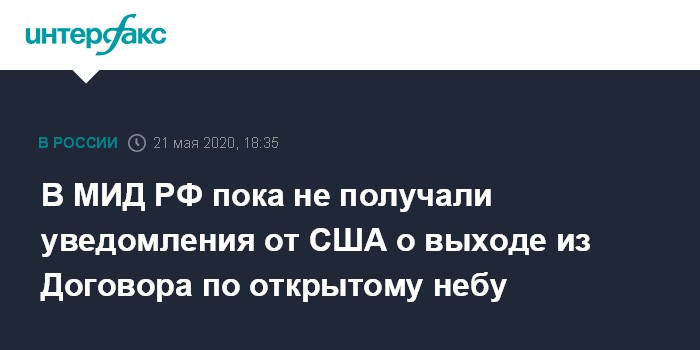 Москва. 21 мая. INTERFAX.RU - Американская сторона не уведомляла Москву о решении выйти из договора по открытому небу, заявили "Интерфаксу" в четверг в МИД России.