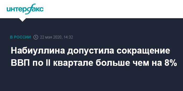 Москва. 22 мая. INTERFAX.RU - В апреле динамика российской экономики соответствовала ожиданиям Банка России, в мае она пока несколько ниже, поэтому спад ВВП во II квартале может превысит изначальный прогноз в 8%, заявила председатель ЦБ Эльвира Набиуллина. Предыдущий прогноз регулятор сделал месяц назад.