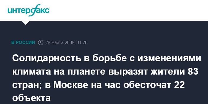 Солидарность в борьбе с изменениями климата на планете выразят жители 83 стран; в Москве на час обесточат 22 объекта