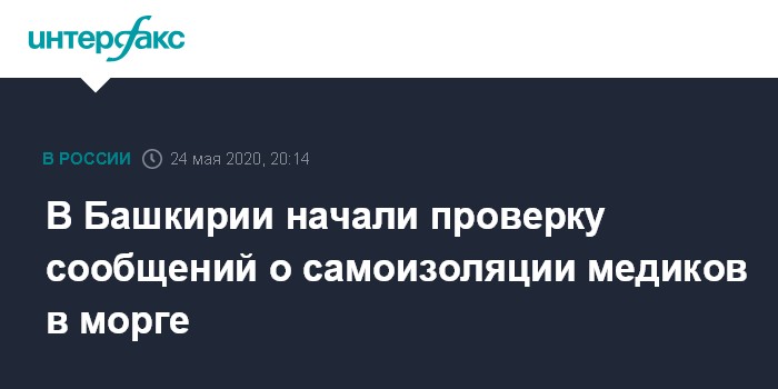 Москва. 24 мая. INTERFAX.RU - Прокуратура Башкирии начала проверку после сообщений местных СМИ о двух медсестрах ГБУЗ РБ Архангельская центральная районная больница, размещенных на самоизоляцию в помещение морга, сообщили "Интерфаксу" в прокуратуре.