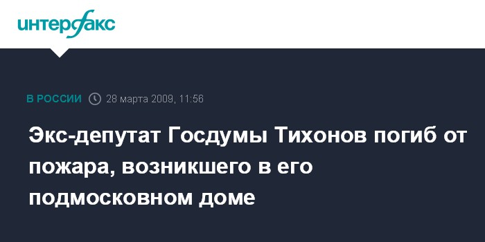 "Инцидент произошел в пятницу вечером в деревне Назарьево в Одинцовском районе Московской области. По предварительным данным, в доме 75-летнего бывшего депутата Государственной Думы загорелась проводка, от которой произошло возгорание. Тихонов пытался потушить возгорание, но погиб. Речи идет о несчастном случае", - рассказал собеседник агентства.