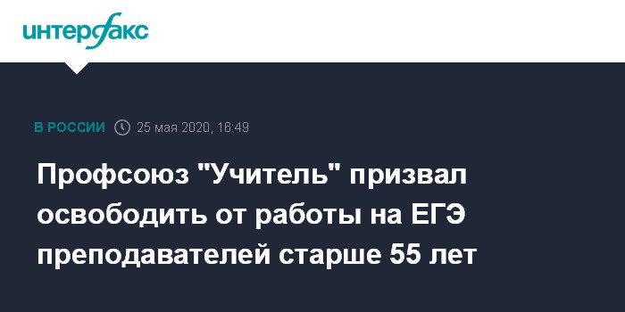 Москва. 25 мая. INTERFAX.RU - Межрегиональный профсоюз работников образования "Учитель" (входит в Конфедерацию труда России) предложил освободить от работы на ЕГЭ учителей старше 55 лет или имеющих хронические заболевания. Об этом сообщил сайт КТР.