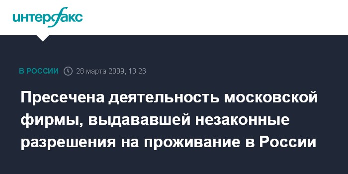 Москва. 28 марта. INTERFAX.RU - Деятельность одной из московских фирм, занимавшейся изготовлением незаконных разрешений на проживание в РФ для иностранцев, пресечена сотрудниками правоохранительных органов, сообщили "Интерфаксу" в пресс-службе управления Федеральной миграционной службы по Московской области в субботу.