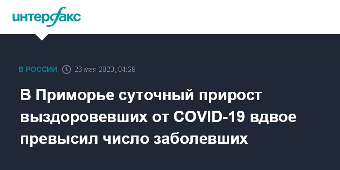 Москва. 26 мая. INTERFAX.RU - Впервые в Приморье за сутки число выздоровевших от COVID-19 вдвое превысило число заболевших, сообщила пресс-служба правительства края.