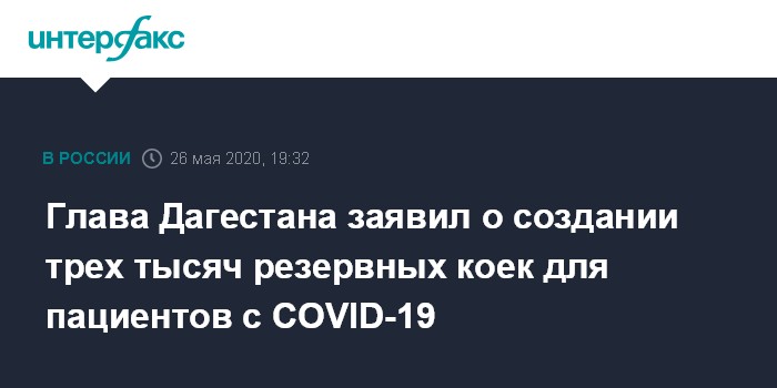 Москва. 26 мая. INTERFAX.RU - Глава Дагестана Владимир Васильев заявил о появлении трех тысяч резервных коев для зараженных коронавирусом, сообщается на сайте главы республики.