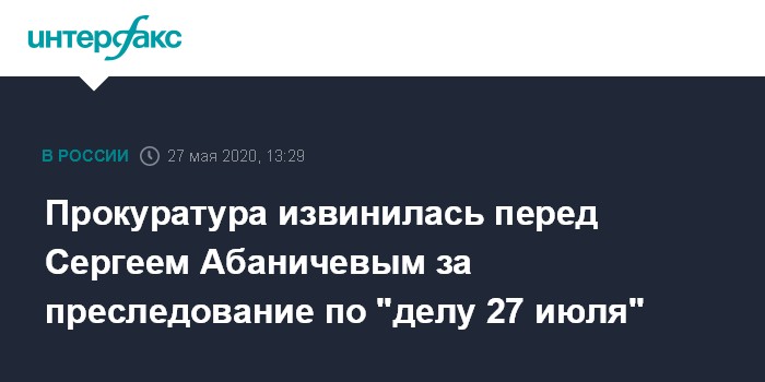 Москва. 27 мая. INTERFAX.RU - Заместитель Басманного межрайонного прокурора от имени государства извинился перед фигурантом "дела 27 июля" Сергеем Абаничевым за необоснованное привлечение к ответственности. Копию документа опубликовал глава "Агоры" Павел Чиков. Интересы Абаничева в судах представляет адвокат "Агоры" Светлана Сидоркина.
