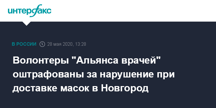 Москва. 28 мая. INTERFAX.RU - В Новгородской области Окуловский районный суд оштрафовал восемь волонтеров "Альянса врачей", которые вместе с членами этого профсоюза 2 апреля решили привезти в регион из Москвы маски для местных врачей. Об этом сообщила пресс-служба Новгородского областного суда.