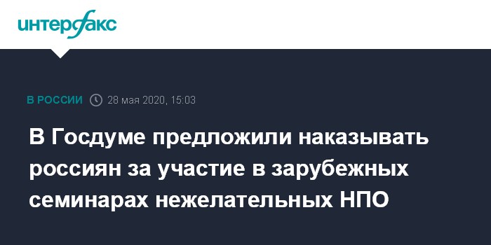Москва. 28 мая. INTERFAX.RU - Комиссия Госдумы по иностранному вмешательству в дела России предложила ввести административную ответственность для россиян за участие в зарубежных мероприятиях организаций, которые в России признаны нежелательными. Об этом сообщил глава комиссии Василий Пискарев.