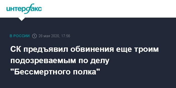 Москва. 28 мая. INTERFAX.RU - Следствие по делу о реабилитации нацизма предъявило обвинения еще троим подозреваемым, задержанным за размещение в интернете под видом советских воинов портретов лидеров и пособников нацистской Германии. Об этом сообщила официальный представитель Следственного комитета России (СКР) Светлана Петренко.