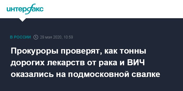 Москва. 29 мая. INTERFAX.RU - Подмосковная прокуратура инициировала проверку сюжета федерального телеканала о том, что под Сергиевом Посадом нашли свалку с тоннами дорогих лекарств.