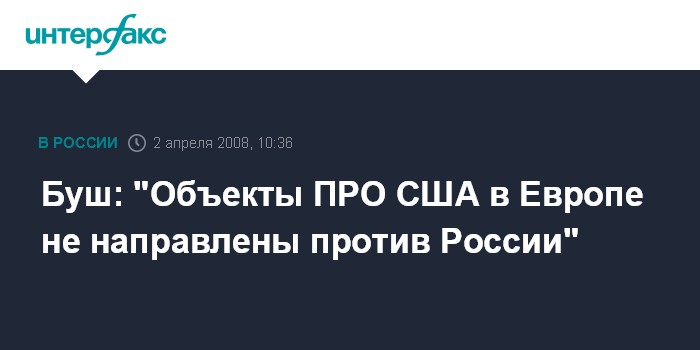 "Я вновь и вновь повторяю: система ПРО, которую мы развиваем, не направлена на то, чтобы защищаться от России. Новый Североатлантический альянс, который мы строим, не является защитой от России", - заявил Дж.Буш на саммите НАТО в Бухаресте.