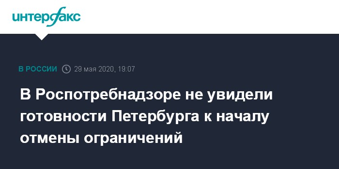 Москва. 29 мая. INTERFAX.RU - Петербург пока не готов к первому этапу отмены ограничений, считают в городском управлении Роспотребнадзора. Об этом телеканалу "Санкт-Петербург" заявила замначальника отдела эпидемиологического надзора управления Ирина Катаева.
