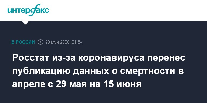 "Публикация данных о рождениях и смертях, браках и разводах осуществляется на основе сведений из Единого государственного реестра записи актов гражданского состояния (ЕГР ЗАГС). В ситуации, когда в большинстве регионов страны в апреле были введены различные меры безопасности, многие жители предпочли отложить регистрацию рождений и смертей в ЗАГСах. Сложившаяся ситуация требует дополнительного времени для уточнения цифр и учета всех поступающих из больниц и клиник окончательных свидетельств о смерти", - поясняют в Росстате причины переноса сроков публикации.