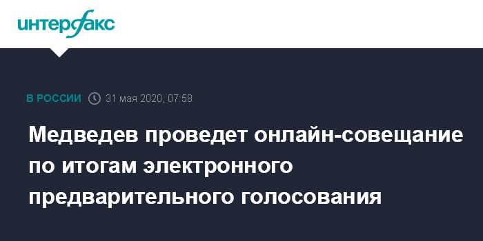Москва. 31 мая. INTERFAX.RU - Председатель "Единой России" Дмитрий Медведев в воскресенье вечером проведет онлайн-совещание с региональными отделениями партии, посвященное завершению электронного предварительного голосования в партии.