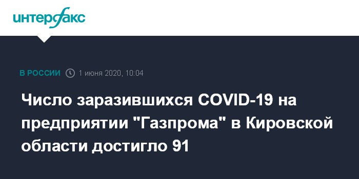 Москва. 1 июня. INTERFAX.RU - В Малмыжском районе Кировской области на предприятии "Газпрома" расширился очаг коронавирусной инфекции, число зараженных достигло 91, сообщили в региональном Роспотребнадзоре.