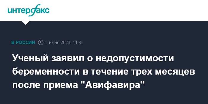 Москва. 1 июня. INTERFAX.RU - Беременеть нельзя в течение трех месяцев после приема "Авифавира", сообщил директор Национального исследовательского центра фтизиопульмонологии и инфекционных заболеваний Минздрава РФ Владимир Чуланов.
