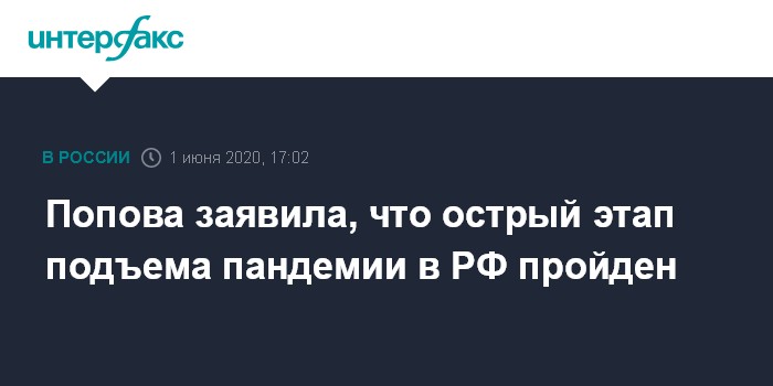 Москва. 1 июня. INTERFAX.RU - Россия уже прошла острый этап подъема пандемии коронавируса, заявила глава Роспотребнадзора Анна Попова.
