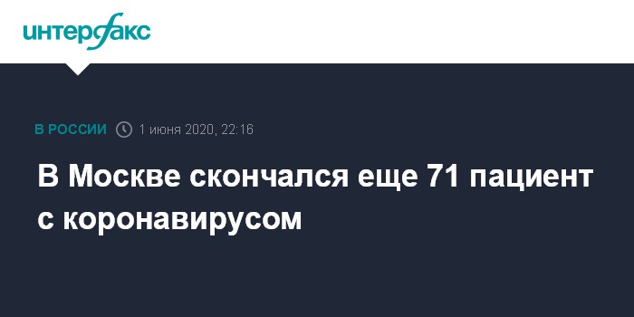 "В Москве скончался 71 пациент, у всех был подтвержден диагноз пневмония и получен положительный результат тестов на коронавирусную инфекцию", - сообщили "Интерфаксу" в оперштабе по контролю и мониторингу ситуации с коронавирусом в Москве.
