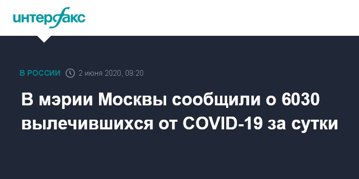 Москва. 2 июня. INTERFAX.RU - В Москве за последние сутки от коронавирусной инфекции вылечились и выздоровели еще 6030 человек, сообщила заммэра города Анастасия Ракова. Днем ранее она сообщила о 3 599 вылечившихся за сутки.