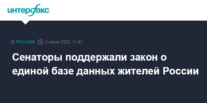 Москва. 2 июня. INTERFAX.RU - Совет Федерации на заседании во вторник одобрил закон о создании единого федерального информационного регистра, содержащего сведения о населении России.
