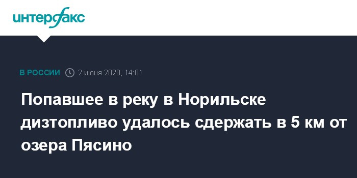 Москва. 2 июня. INTERFAX.RU - Распространение дизельного топлива, разлившегося в результате аварии на ТЭЦ в Норильске, удалось сдержать боновыми заграждениями на реке в нескольких километрах от озера Пясино. Об этом сообщает во вторник пресс-служба Всемирного фонда дикой природы в России (WWF).