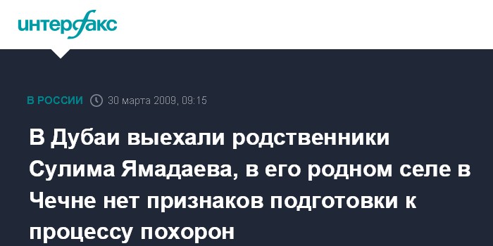 В то же время нет никаких признаков подготовки к похоронам и в городе Гудермес, где проживала семья Ямадаева. "Одни говорят, что убит некий Мадов. Другие заявляют, что Мадов - это фактический Ямадаев и созвучны фамилии, а также созвучно имя Сулейман, которое упоминается в связи с убийством некоего чеченца в Дубаи", - подчеркивают собеседники.