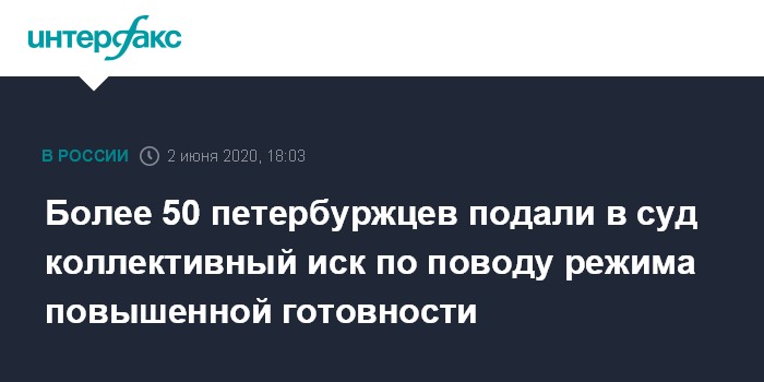 Москва. 2 июня. INTERFAX.RU - Санкт-Петербургский городской суд рассмотрит коллективный иск к Смольному по поводу режима повышенной готовности.