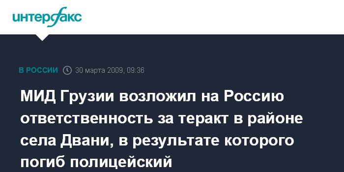 Москва. 30 марта. INTERFAX.RU - МИД Грузии возлагает всю ответственность за теракт в районе села Двани, в результате которого погиб один и ранены шесть полицейских, на Россию и требует от международного сообщества "соответствующего реагирования".
