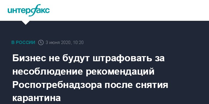"Предприниматели получили разъяснение в части контроля за соблюдением методических рекомендаций Роспотребнадзора. Штрафовать представителей бизнеса не планируется. Следовать рекомендациям - в их интересах", - сообщили журналистам в секретариате первого вице-премьера РФ Андрея Белоусова.