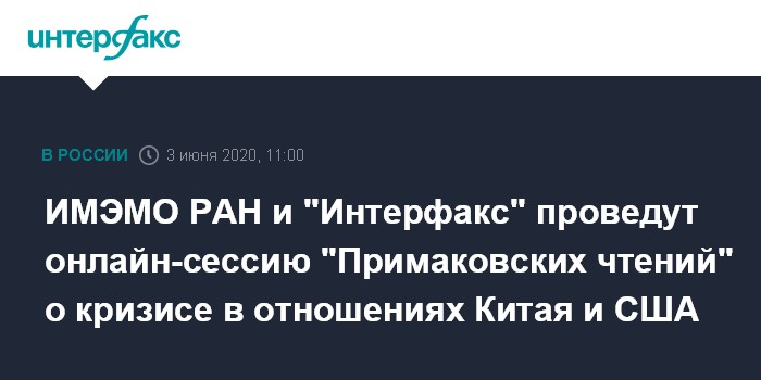Москва. 3 июня. INTERFAX.RU - В четверг, 4 июня, в 14:00 в информационном агентстве "Интерфакс" состоится онлайн-сессия "Примаковских чтений" на тему "Китай-США: есть ли угроза трансформации возникающей биполярности в холодную войну 2.0?".