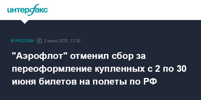 Москва. 3 июня. INTERFAX.RU - "Аэрофлот" отменил сбор за переоформление купленных с 2 по 30 июня билетов на перелеты по России, сообщила авиакомпания.