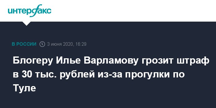 Москва. 3 июня. INTERFAX.RU - Тульская полиция завела административное дело на известного российского блогера Илью Варламова за несанкционированную прогулку по Казанской набережной в Туле, закрытой для посещений из-за распространения коронавируса.