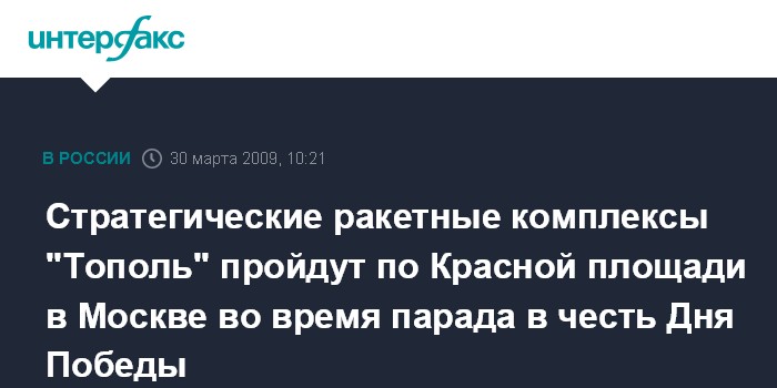Москва. 30 марта. INTERFAX.RU - Более 100 единиц боевой техники, в том числе мобильные пусковые установки межконтинентальных ракет "Тополь" примут участие в военном параде на Красной площади в Москве 9 мая в честь 64-й годовщины победы в Великой Отечественной войне, сообщили "Интерфаксу-АВН" в российском военном ведомстве.