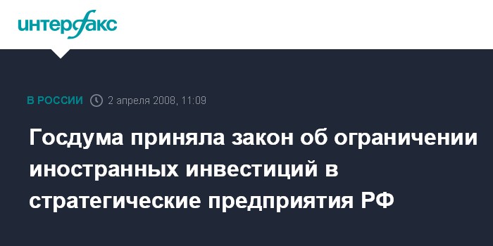 Москва. 2 апреля. INTERFAX.RU - Госдума на пленарном заседании в среду приняла в третьем чтении закон "О порядке осуществления иностранных инвестиций в хозяйственные общества, имеющие стратегическое значение для обеспечения обороны страны и безопасности государства".