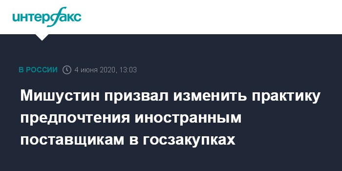 Москва. 4 июня. INTERFAX.RU - Председатель правительства РФ Михаил Мишустин указал на необходимость изменить практику госзакупок и закупок госкомпаниями, когда заказчики отдают предпочтение иностранным поставщикам.