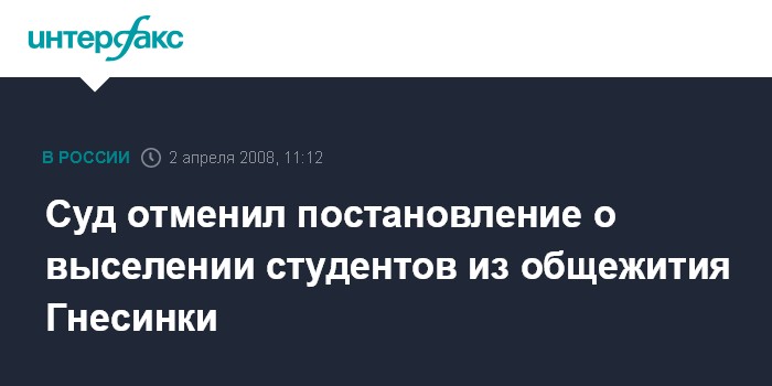 Москва. 2 апреля. INTERFAX.RU - Савеловский суд Москвы отменил постановление о выселении из общежития студентов Российской академии музыки (РАМ) имени Гнесиных, сообщила член студенческого актива академии Екатерина Алексеева.